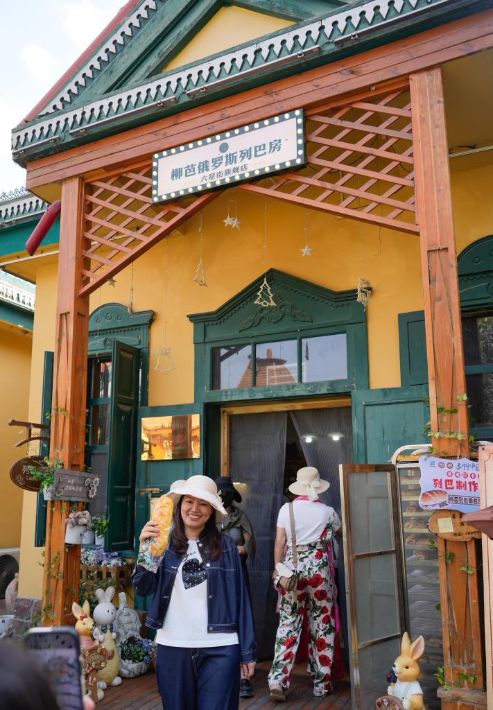 9月8日,游客在六星街一家面包店门前留影。新华社记者 张浩波 摄