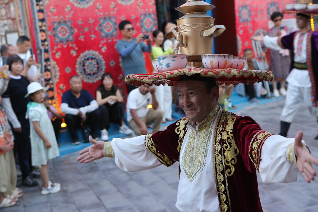 7月22日,在新疆库车市的龟兹小巷,演员表演顶碗舞。新华社记者 王婧嫱 摄