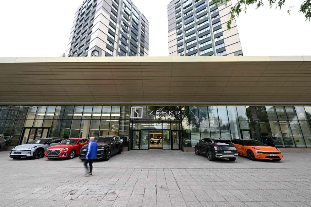 5月26日,在哈萨克斯坦阿拉木图市区,一名男子从一家中国品牌新能源汽车门店前走过。新华社记者 李任滋 摄