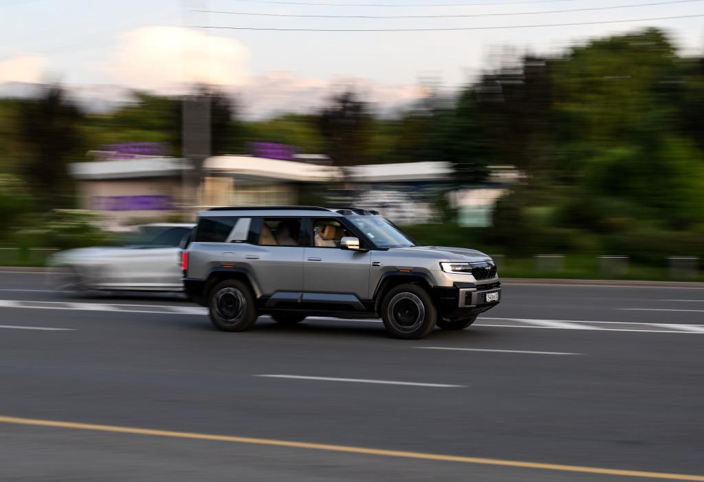 5月15日,一辆中国品牌新能源汽车行驶在哈萨克斯坦阿拉木图市区。新华社记者 李任滋 摄