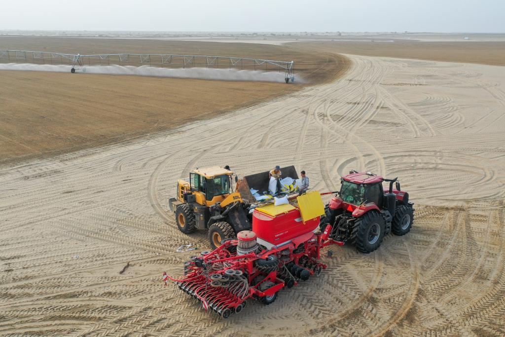 在新疆和田地区策勒县4万亩苜蓿种植基地,农机手驾驶机械在播种苜蓿(9月9日摄,无人机照片)。新华社记者 丁磊 摄