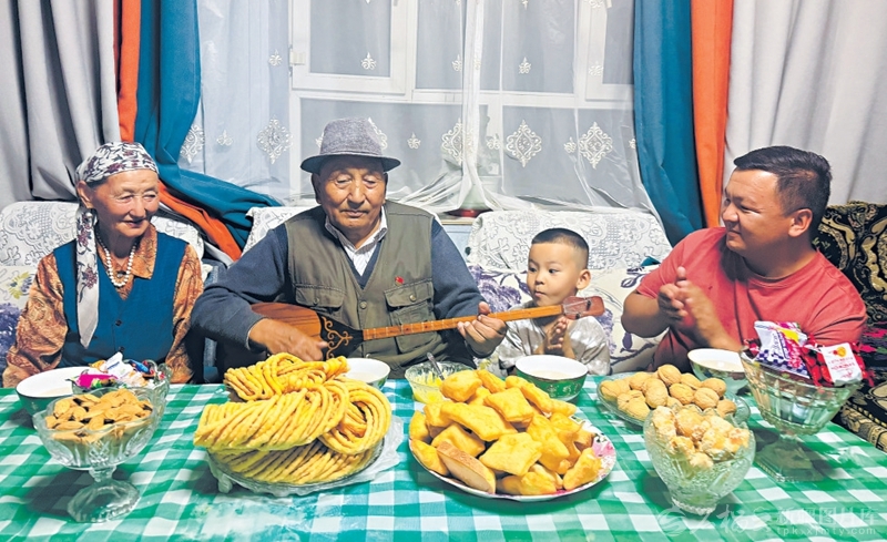 多布墩老人在宽敞明亮的家中弹奏冬不拉(9月8日摄)。图片由新疆图片库提供