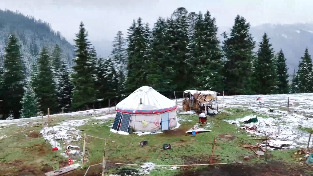 初雪悄然落下,轻柔拂过松枝,留下点点白痕。牛羊踏着薄雪悠然踱步,身影在雪色中格外灵动。白色毡房错落分布,在翻滚的云海间时隐时现,宛如仙境里的静谧居所。