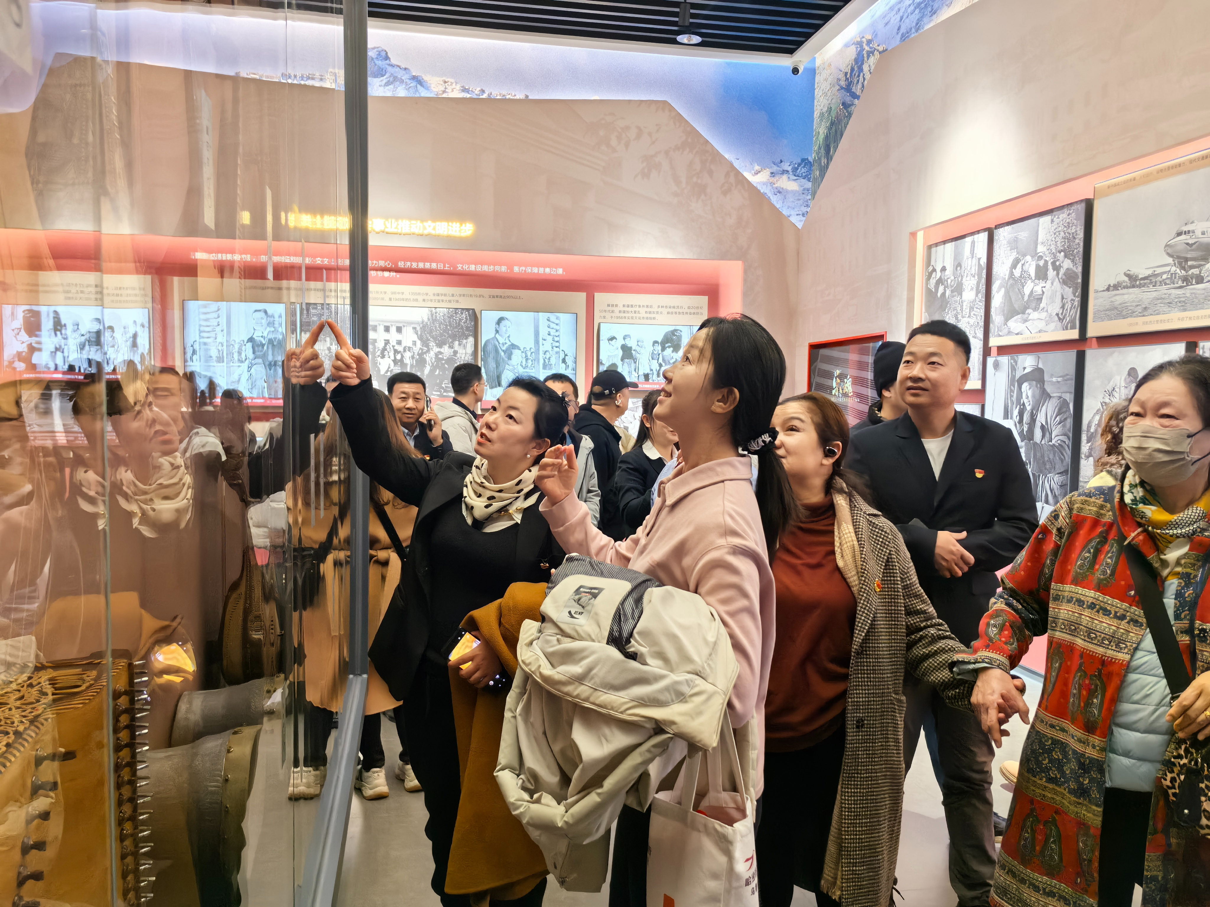 在讲解员引导下,党员们依次参观各展区,不时驻足细看。从再现自治区成立历史时刻的视频资料,到天山百货大楼复原场景;从达里雅布依村新旧对比,到柯柯牙生态治理卫星图;从果子沟大桥、乌鲁木齐国际机场模型,到±1100千伏直流换流变压器、深地塔科1井万米岩芯,大家全方位领略了新疆在经济发展、民生改善、生态文明、民族团结等方面的辉煌成果。