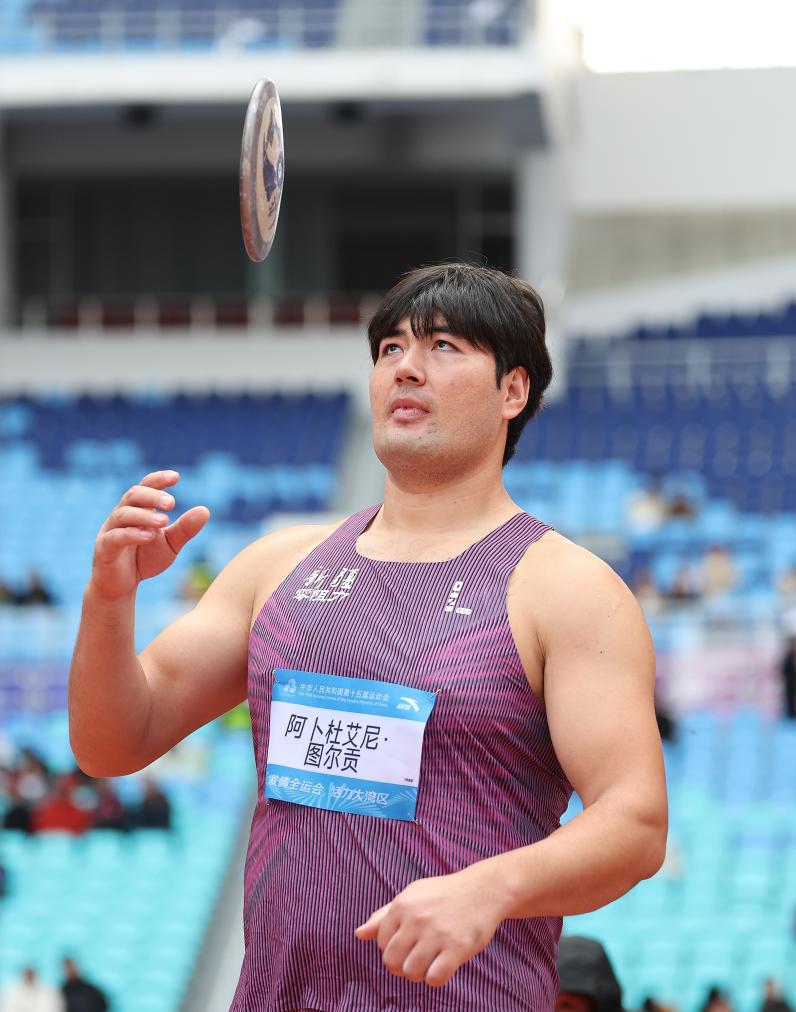 11月20日,新疆队选手阿卜杜艾尼·图尔贡在试投前。他以64米40的成绩夺得冠军。新华社记者 江汉 摄