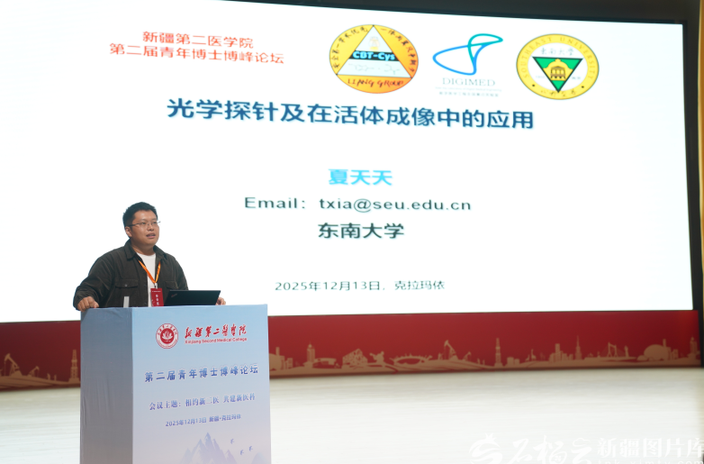 12月13日,在新疆第二医学院第二届青年博士博峰论坛上,来自东南大学的博士夏天天正在进行学术交流。新疆第二医学院供图