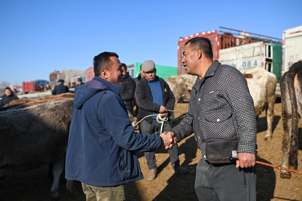 在新疆创锦黄公农产品交易市场,交易达成后,马军(右)与售牛的村民握手致意(12月1日摄)。新华社记者 胡虎虎 摄