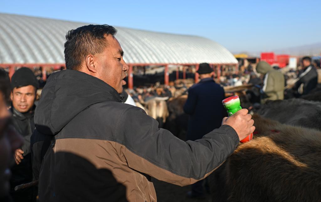 马军在新疆创锦黄公农产品交易市场为客户挑牛(12月3日摄)。新华社记者 胡虎虎 摄