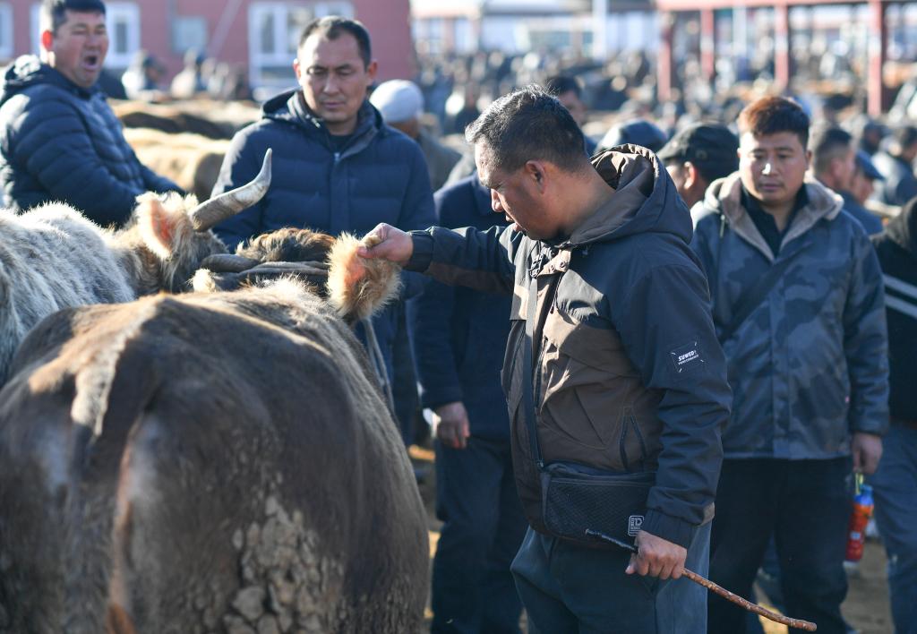 牲畜经纪人马军来自新疆伊宁县,已从业多年。这次,他掌握买家的具体需求后,来到了“皇宫巴扎”。在他看来,牲畜经纪人的首要技能就是准确相中出肉率更高的待售牛羊。丰富的经验让他能摸摸牛的耳朵、肋骨就知道膘情、肉量如何。观毛色、辨品种、看体形、摸关节……选好牛羊后,他就要开始和牧民谈价格。