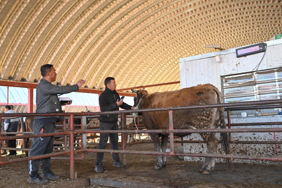 马军(中)带着来自青海的客户(左)在新疆创锦黄公农产品交易市场上选购牛(12月1日摄)。新华社记者 胡虎虎 摄