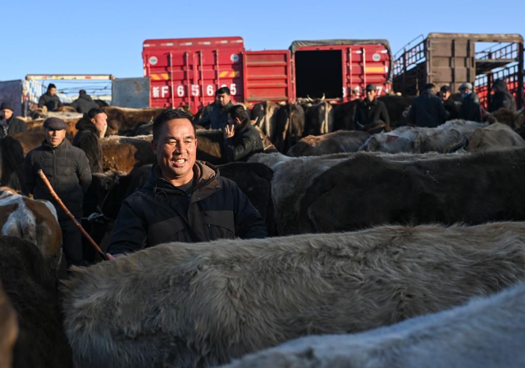 马军在新疆创锦黄公农产品交易市场为客户挑选牛(12月3日摄)。新华社记者 胡虎虎 摄