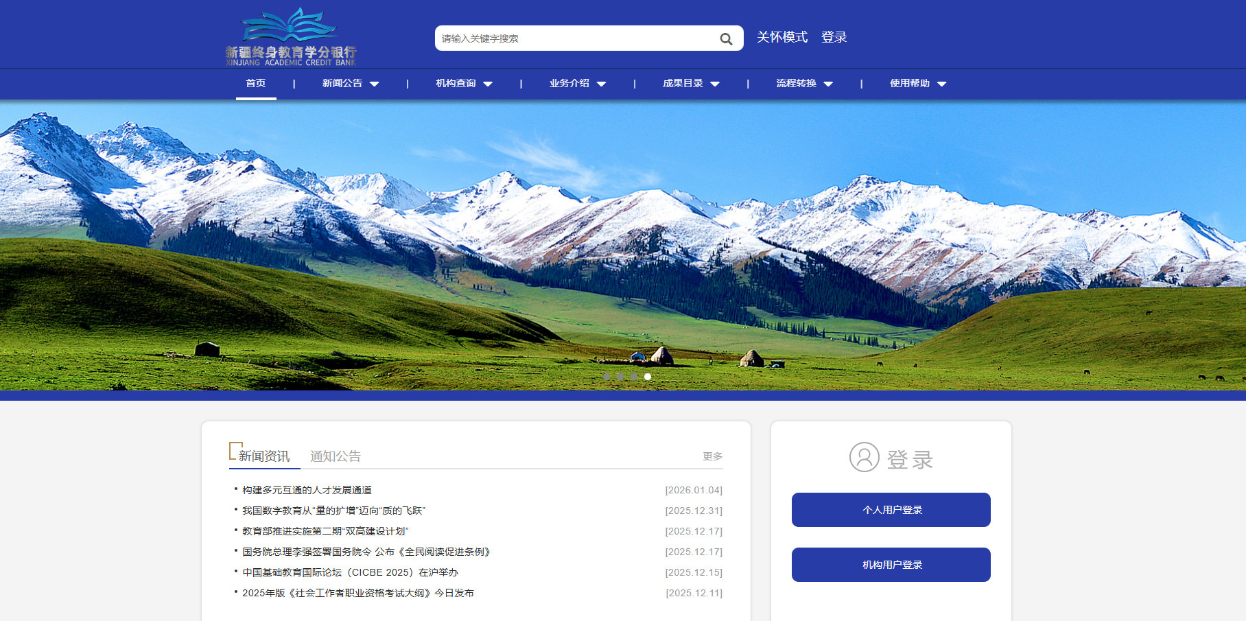 学习成果转换工作依托新疆终身教育学分银行开展。新疆终身教育学分银行是面向全体学习者的终身学习公共服务平台,提供学习成果认证、存储与学分转换等服务,并通过统一标准和流程,实现不同类型学习成果规范管理与互认互通,为学习者终身学习提供支撑。