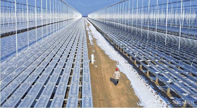 1月12日,工作人员在位于哈密市伊州区的大唐石城子100万千瓦“光热+光伏”一体化清洁能源示范项目现场巡查。目前,该项目90万千瓦光伏部分已并网发电,10万千瓦光热部分进入攻坚阶段,不久将实现全面投产。蔡增乐 摄