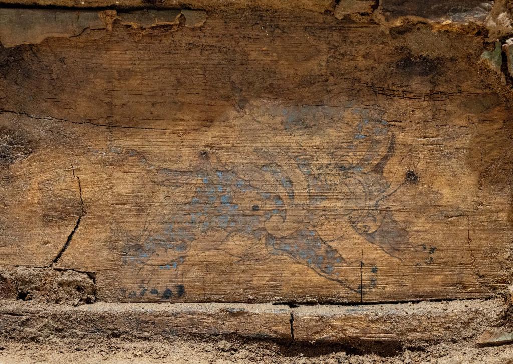 这是在实验室考古方舱内拍摄的彩绘着朱雀图案的木棺前档(2月1日摄)。