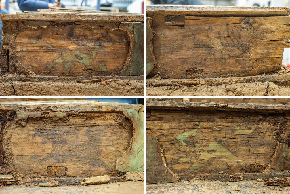 据中国社会科学院科技考古与文化遗产保护重点实验室副研究员刘勇介绍:该墓经科技考古人员通过套箱整体移至实验室内清理保护。目前已清理出木棺具、木屏风、木榻、木箱等遗物。其中,保存完整的彩绘木棺座以及带有彩绘和文字的木屏风等文物十分罕见。彩绘木棺座南北两侧对称各分布6个壸门,壸门内彩绘形态各异的“瑞兽”,壸门上方为叠涩结构并绘制有精美的瑞草。经科学测年并向相关领域专家咨询,初步判定该墓为唐中期葬于西州(今新疆吐鲁番)地区的高等级官员墓,结合墓葬形制,初步推断为三品官员。