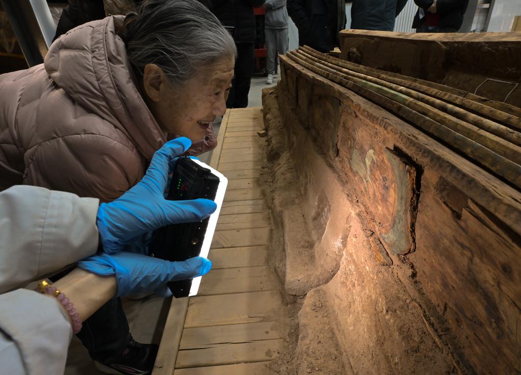 中国社会科学院考古研究所研究员安家瑶在实验室考古方舱内仔细察看墓葬M20出土木棺座上的彩绘图案(2月1日摄)。