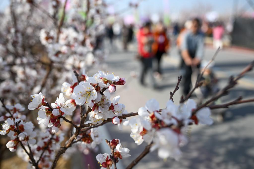 3月20日,在新疆吐鲁番市托克逊县南湖杏花村,游客和当地居民参与游园活动。