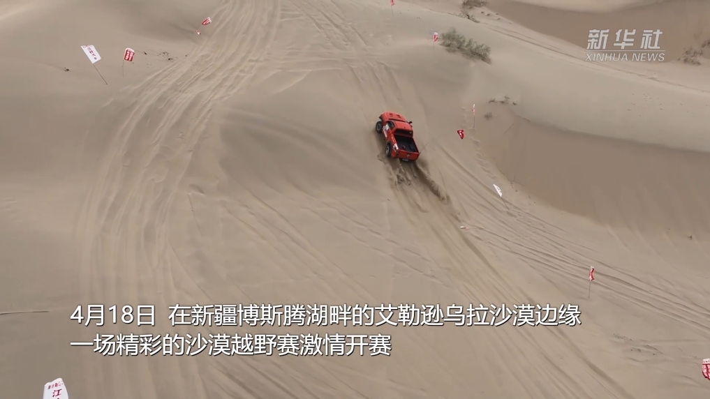 4月18日,在新疆博斯腾湖畔的艾勒逊乌拉沙漠边缘,一场精彩的沙漠越野赛激情开赛。