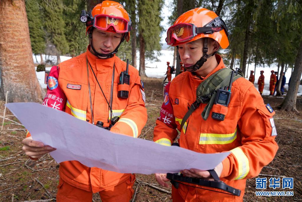 3月15日,巩留县森林消防大队大队长尤红超(左)和同事在林区查看地形。新华社记者 赵戈 摄