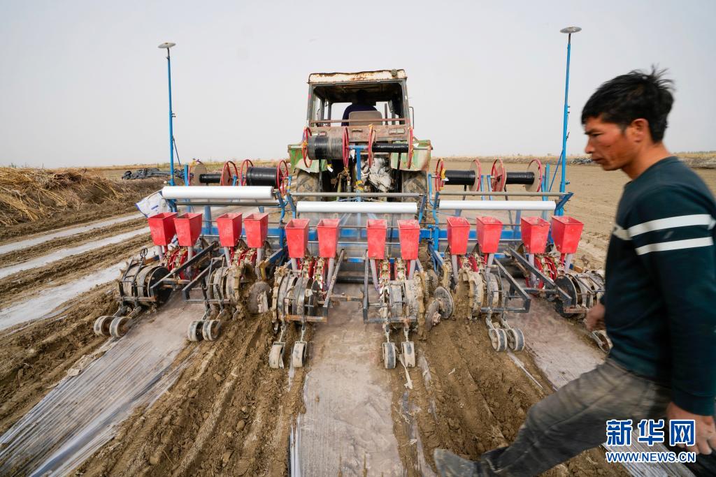 新疆尉犁县巴西买里村,尔肯·热衣木驾驶拖拉机在棉田铺设地膜和播种(4月21日摄)。新华社记者 赵戈 摄