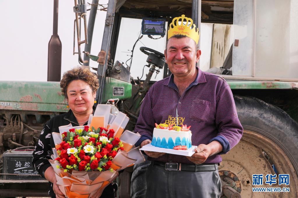 新疆尉犁县巴西买里村,尔肯·热衣木(右)端着生日蛋糕,和爱人站在拖拉机前留影(4月17日摄)。新华社发(汪志鹏 摄)