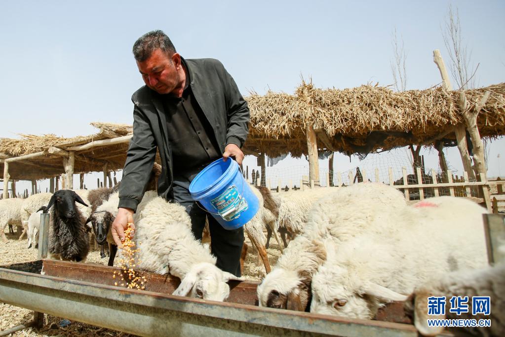 新疆尉犁县巴西买里村,尔肯·热衣木给羊喂食(3月29日摄)。新华社记者 郝昭 摄