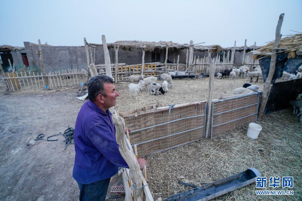新疆尉犁县巴西买里村,天色渐暗,忙完农活的尔肯·热衣木查看自家的羊群(4月21日摄)。新华社记者 赵戈 摄
