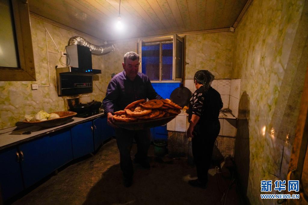 新疆尉犁县巴西买里村,回到家中,尔肯·热衣木帮着爱人一起炸油饼(4月21日摄)。新华社记者 赵戈 摄