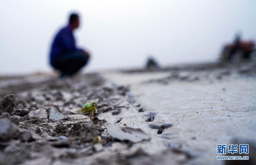 新疆尉犁县巴西买里村,天色渐暗,尔肯·热衣木蹲在棉田里,看着拖拉机来回作业,盼着田里的棉花嫩芽全部成活(4月21日摄)。新华社记者 赵戈 摄