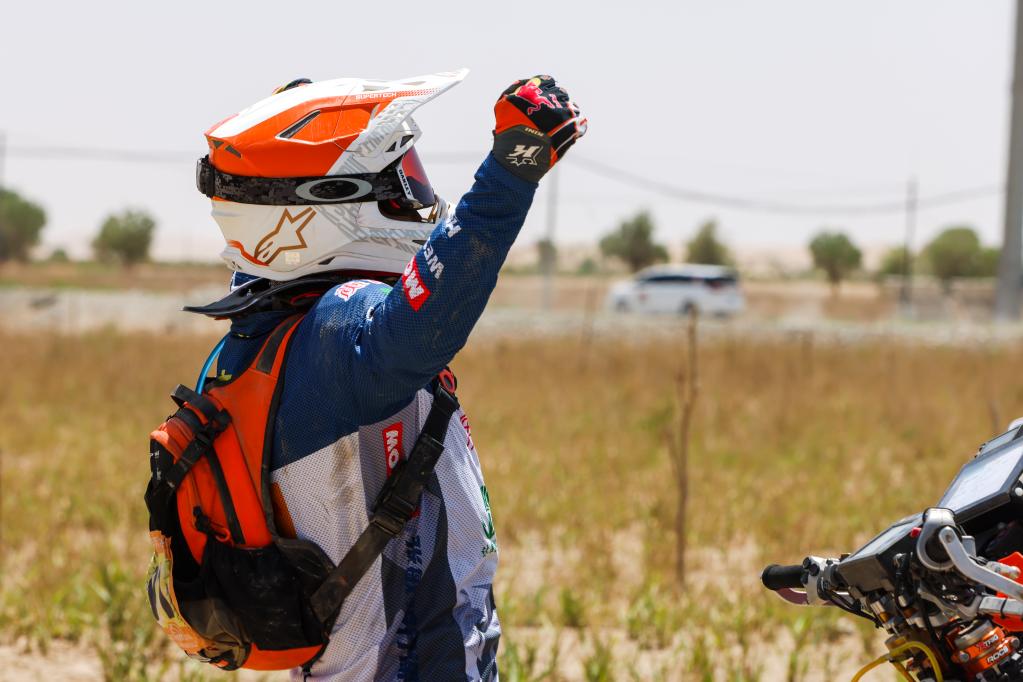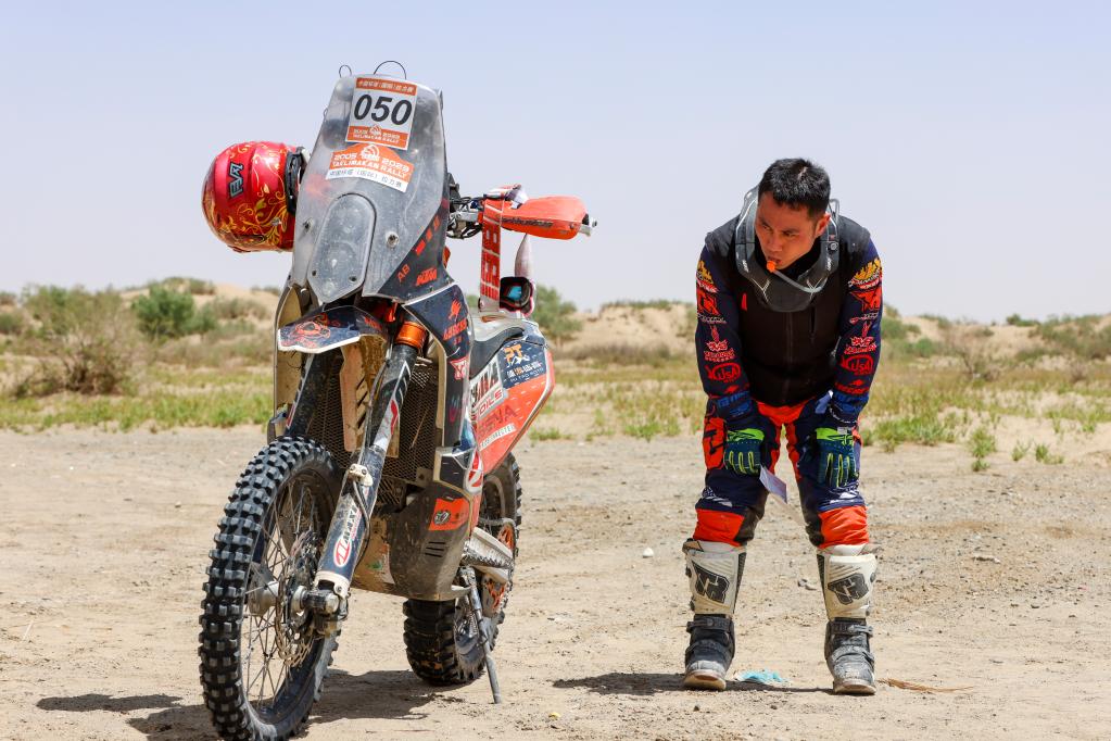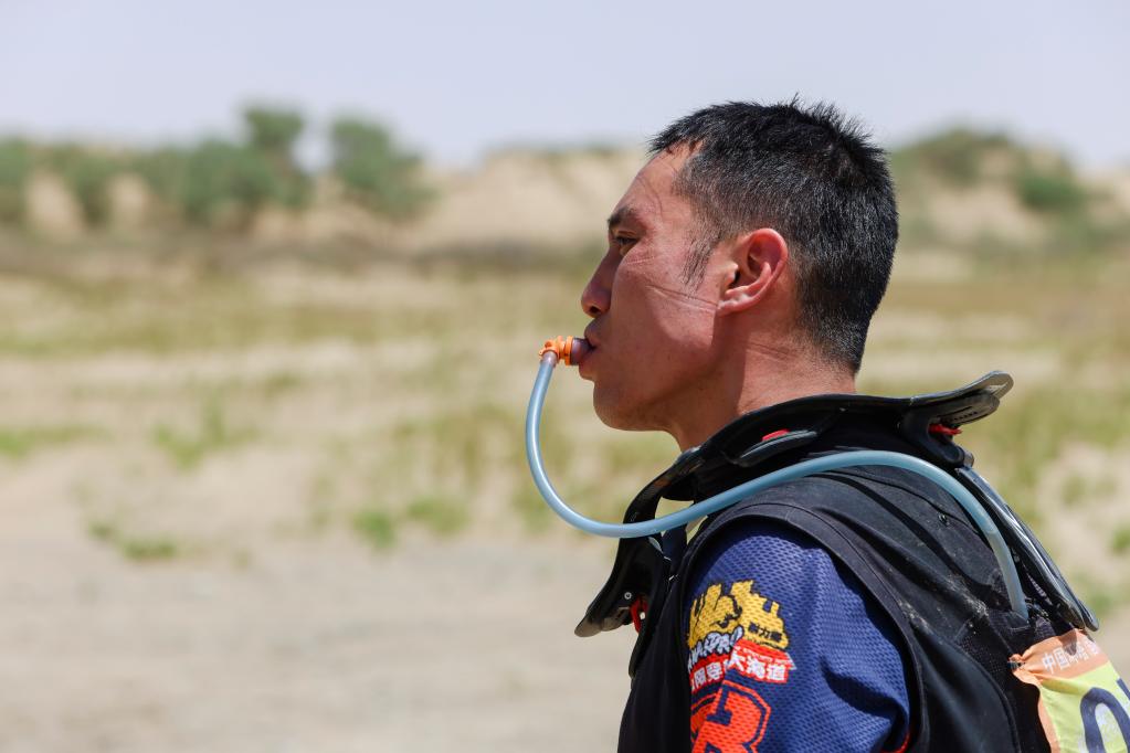 5月29日,陕西云翔汽摩运动有限公司车队车手訾云亮越过终点后补水休息。新华社记者 郝昭 摄