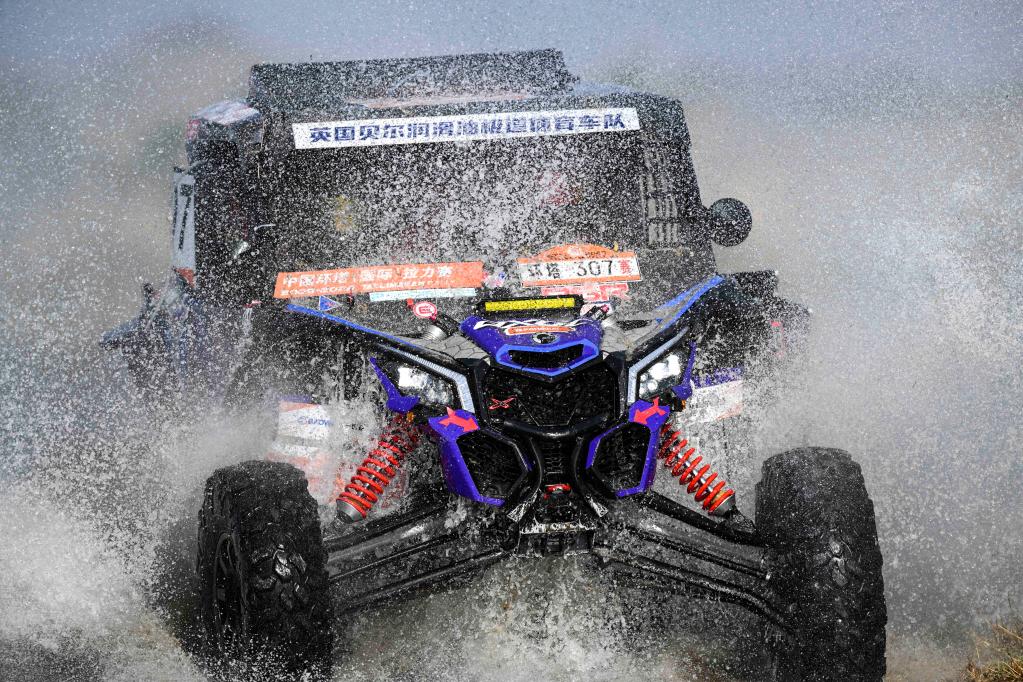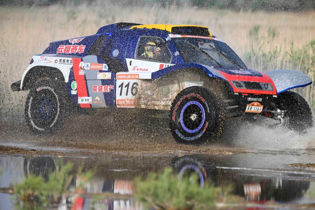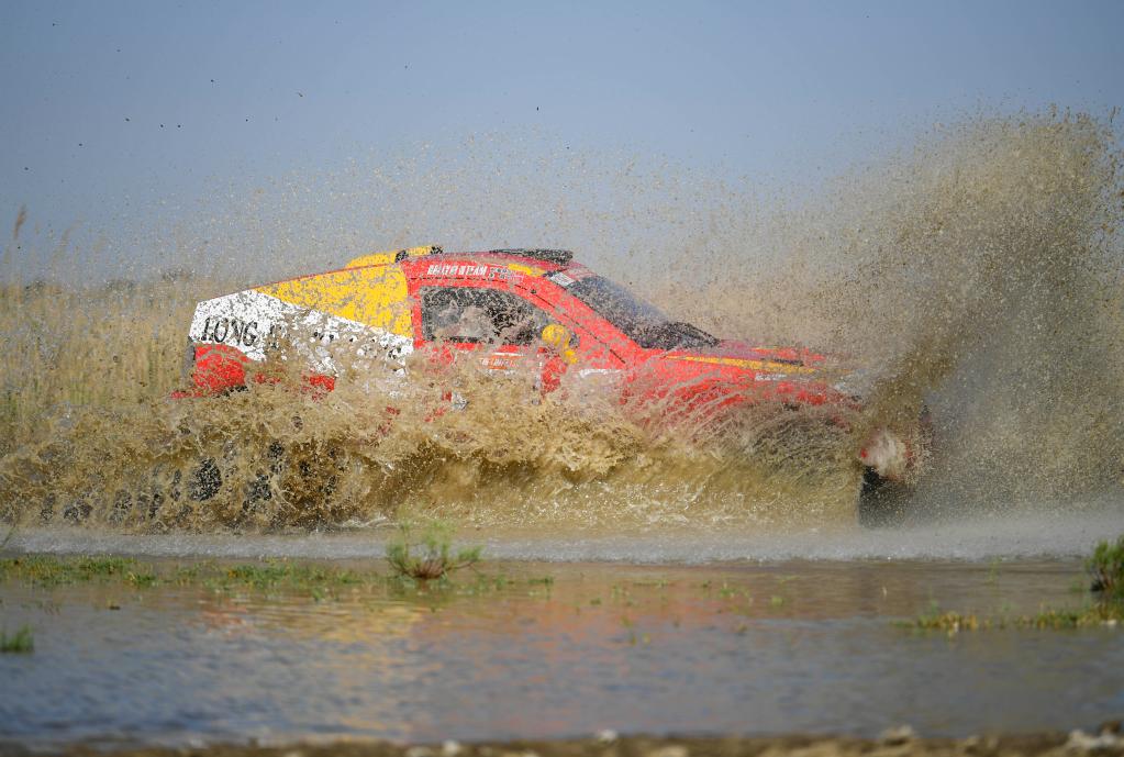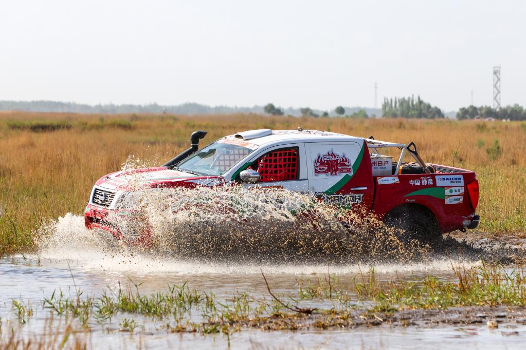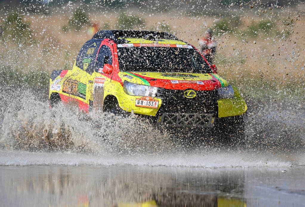 5月29日,黑龙江龍嘉先越拉力艺车队车手朱晖、领航员刘海林驾驶赛车冲过涉水路段。新华社记者 胡虎虎 摄
