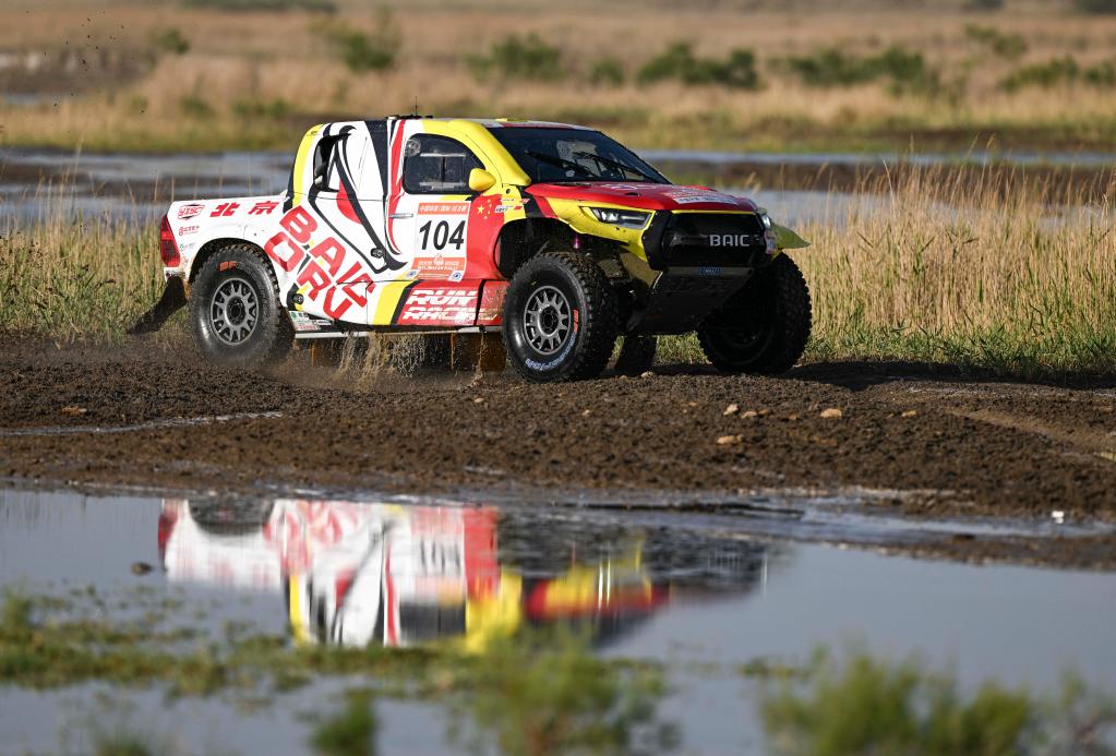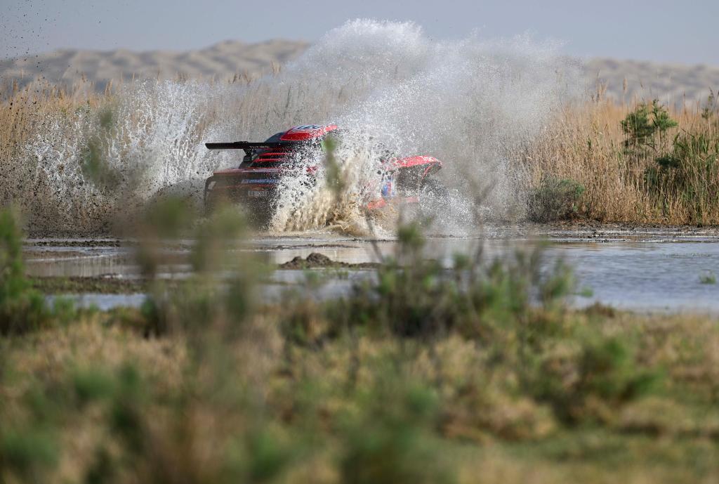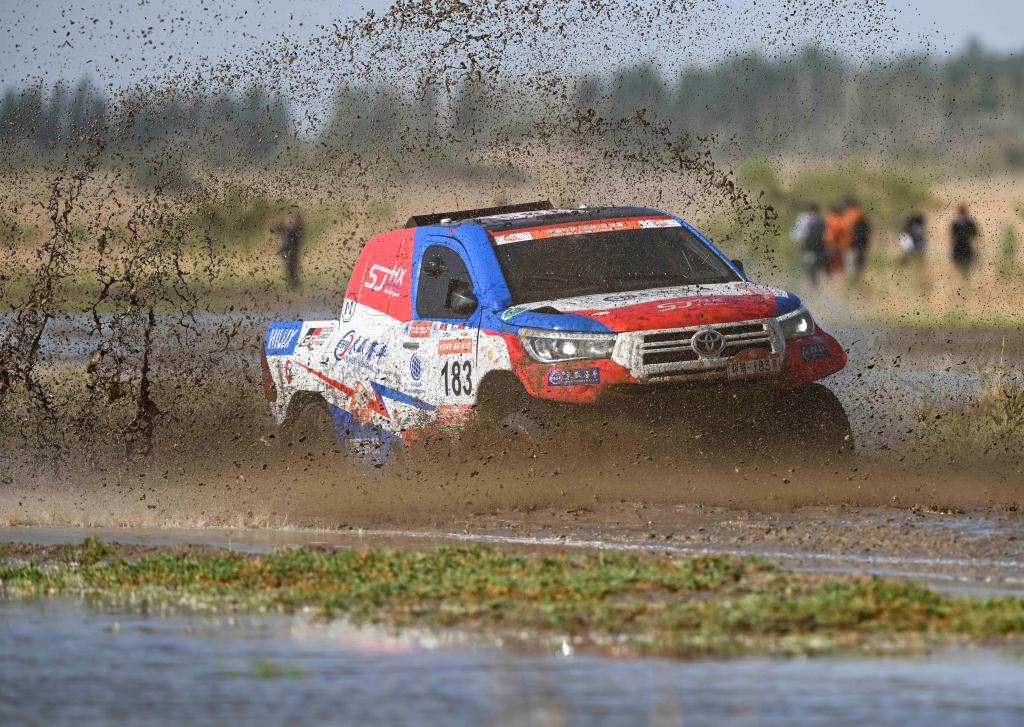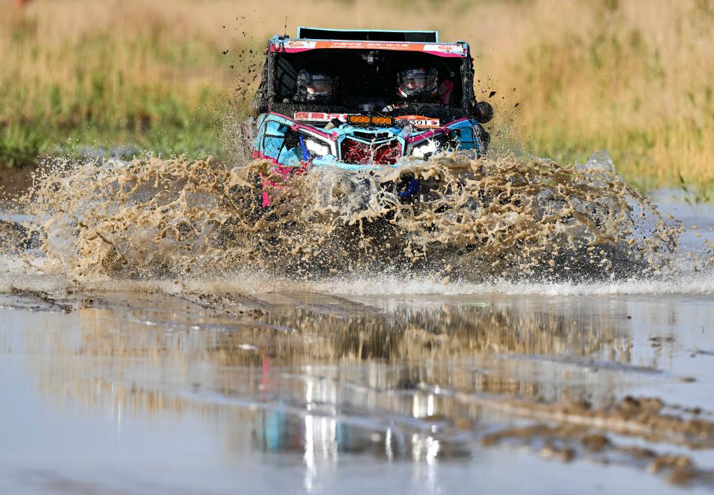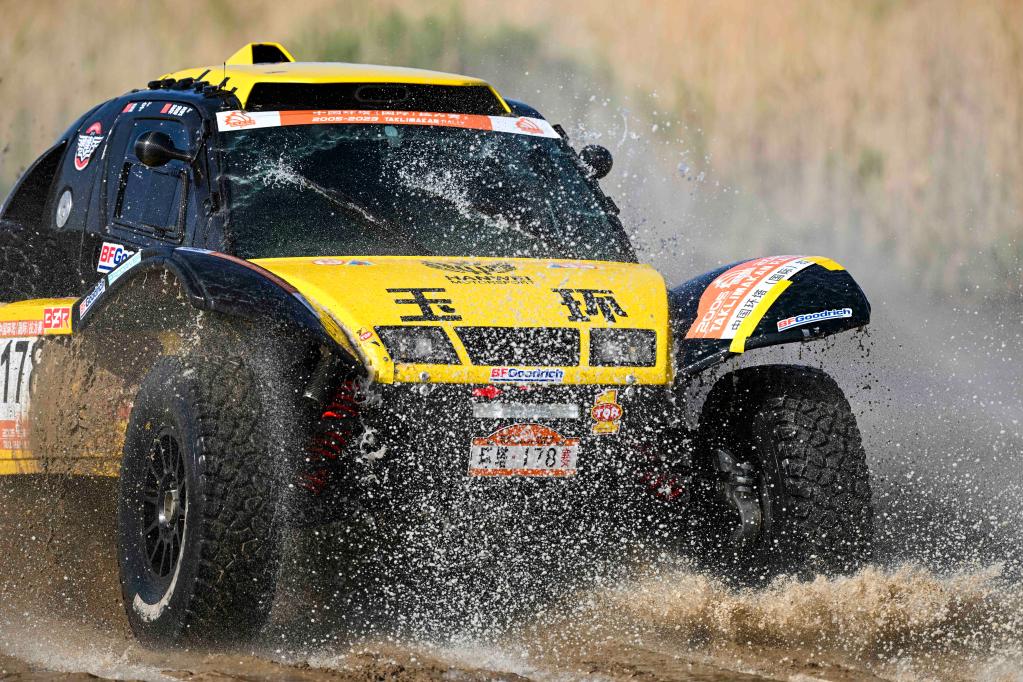5月29日,黑龙江龍嘉先越拉力艺车队车手朱晖、领航员刘海林驾驶赛车冲过涉水路段。新华社记者 胡虎虎 摄