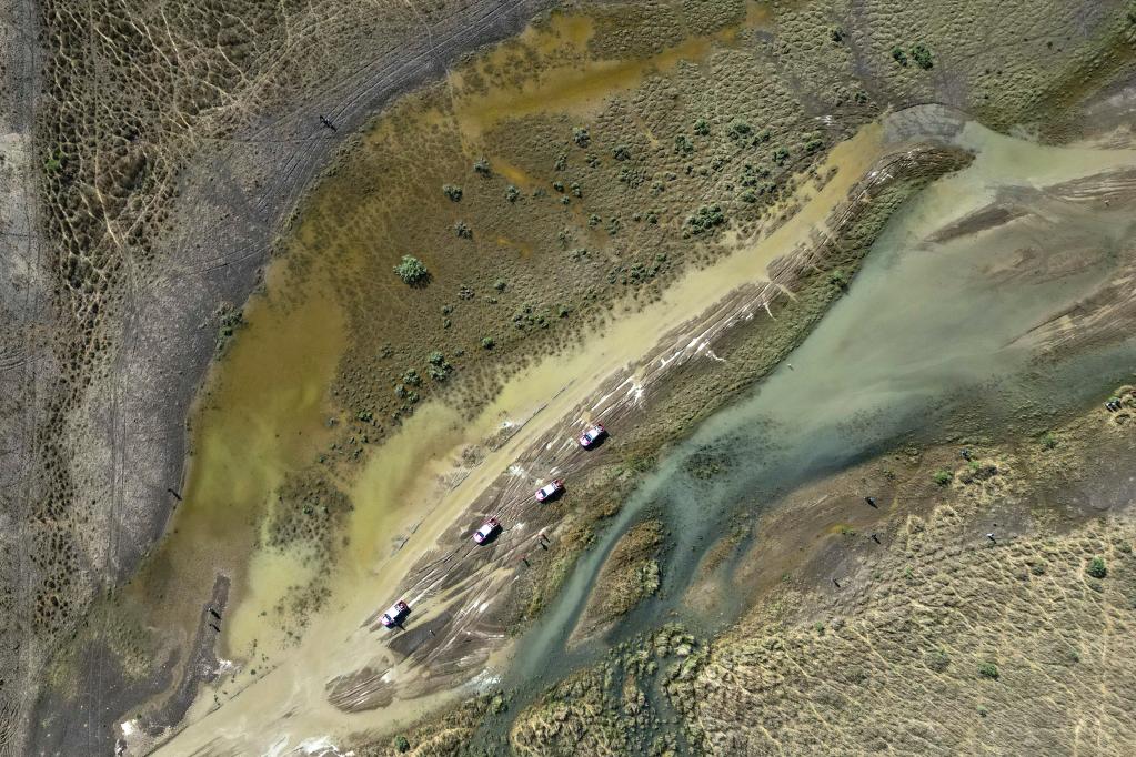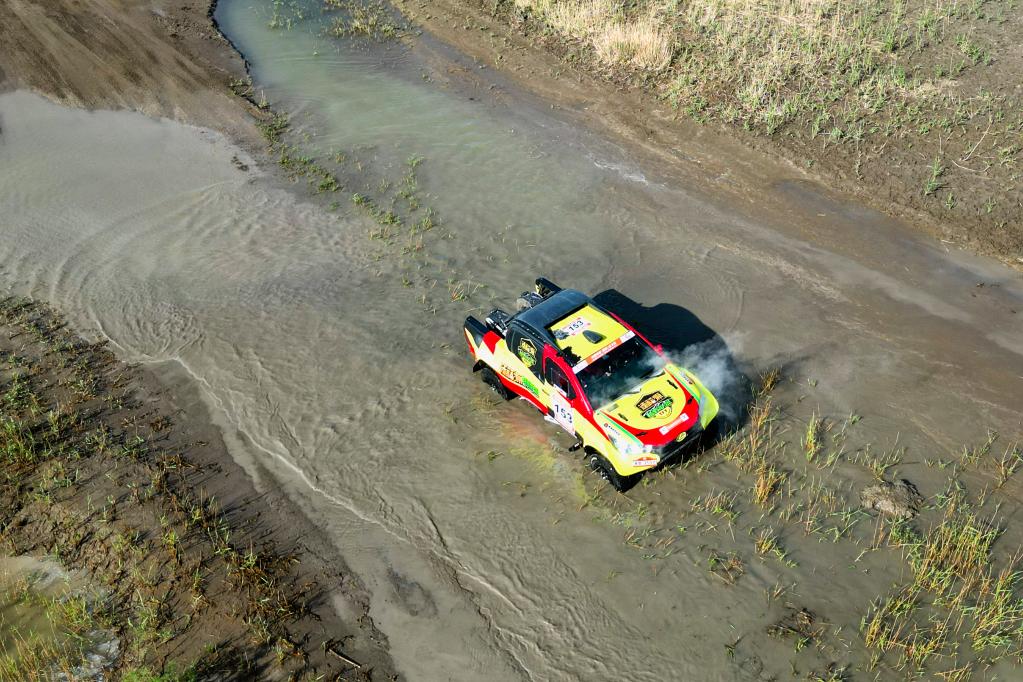 5月29日,明源实业CR6赛车队车手王明磊、领航员刘吉峰驾驶赛车穿过一处涉水路段(无人机照片)。新华社记者 郝昭 摄