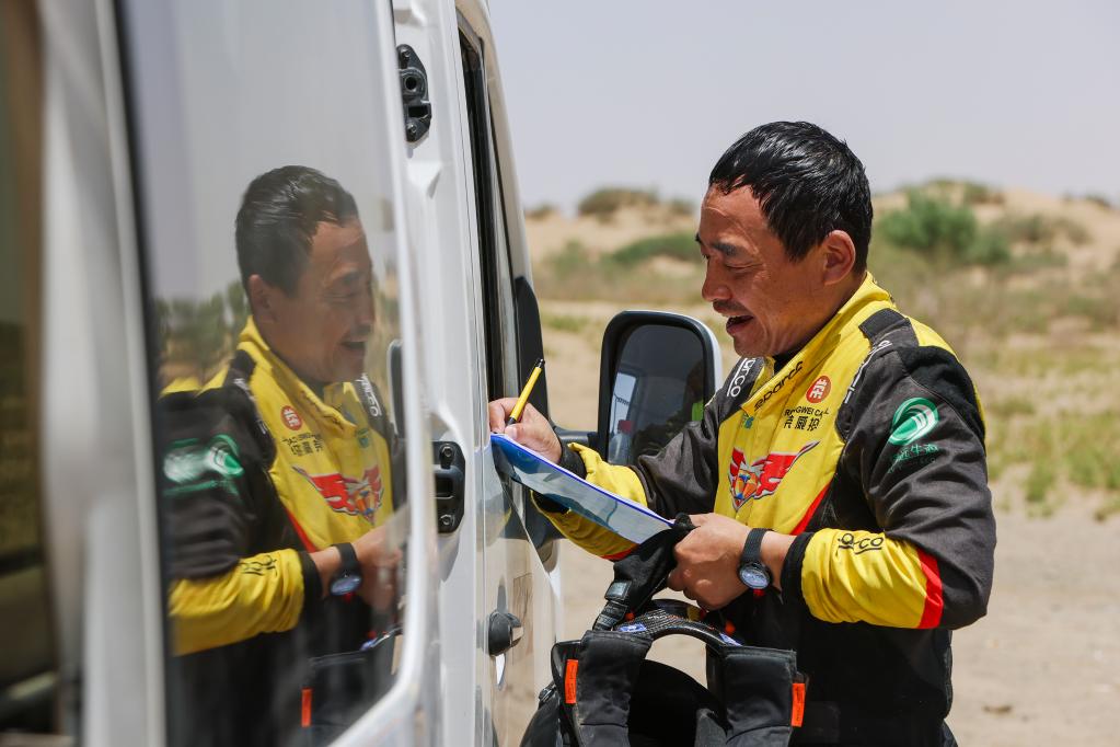 5月29日,陕西云翔汽摩运动有限公司车队领航员廖岷在终点处和裁判核对赛道用时。新华社记者 郝昭 摄