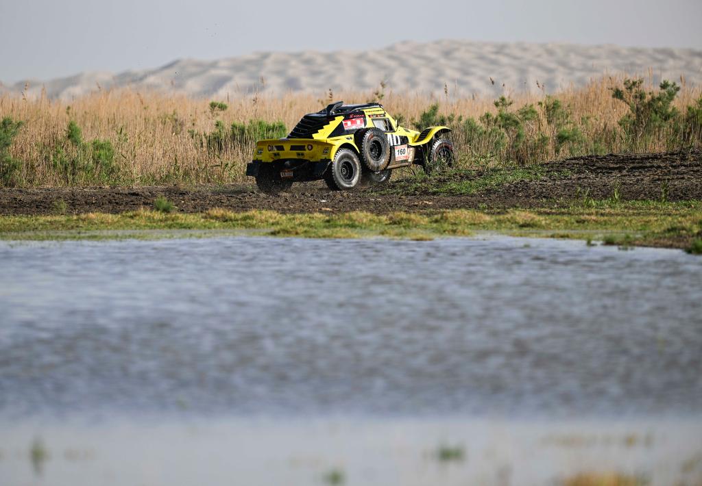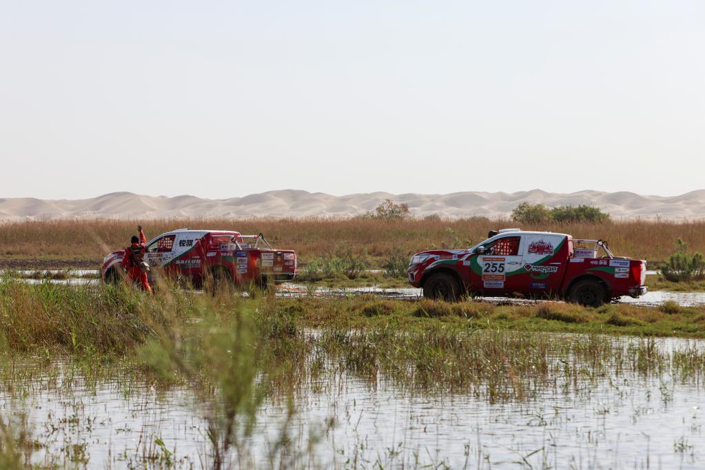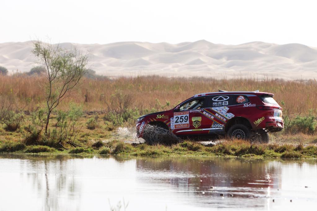 5月29日,广东硬虎赛车DO轮毂车队车手潘静波、领航员冯从彪驾驶赛车穿过涉水路段后,向赛道远处的沙丘前进。新华社记者 胡虎虎 摄