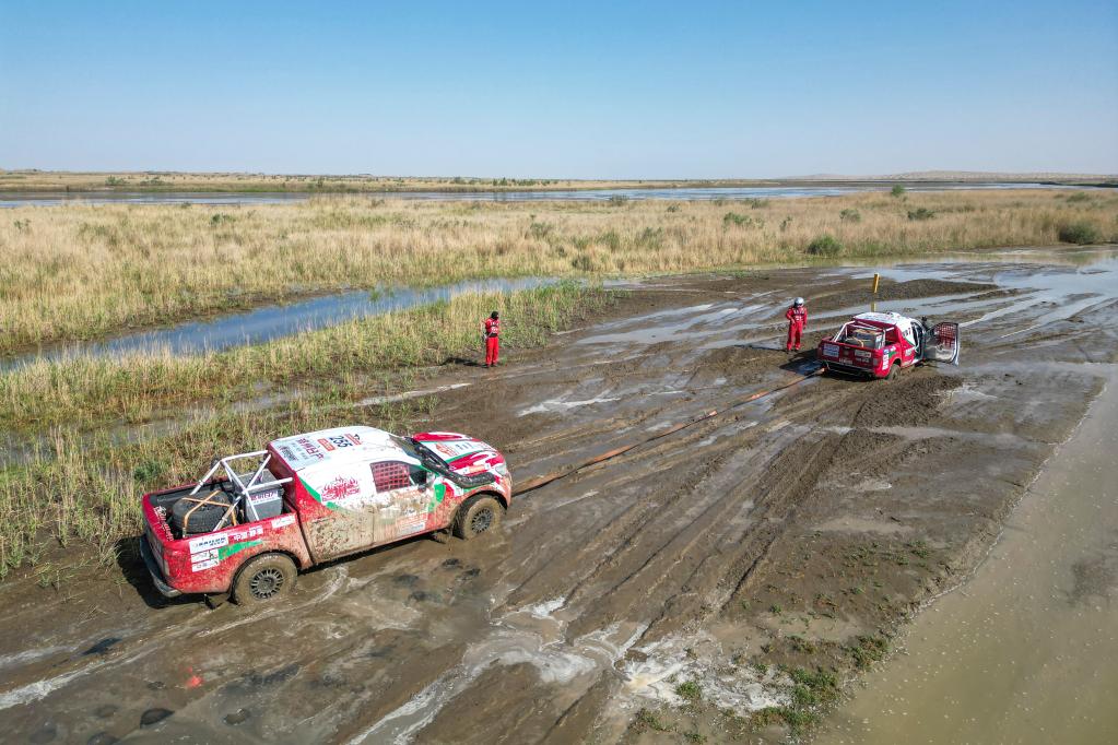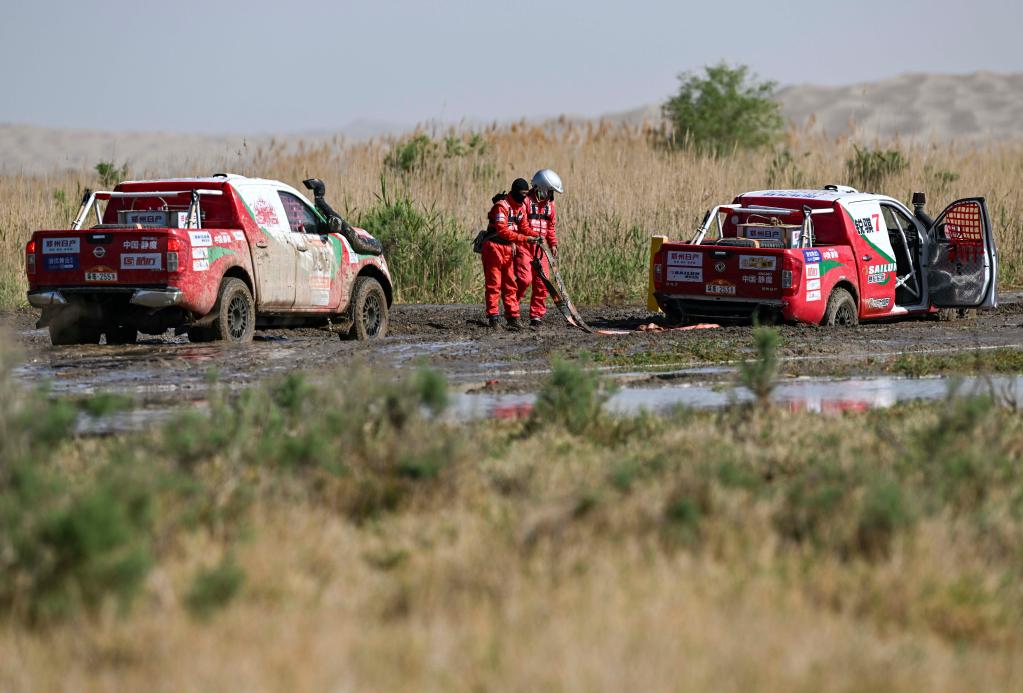 5月29日,郑州日产纳瓦拉黑曼巴减震器车队车手海双增、领航员黄召兵驾驶赛车(左)帮助队友赵喜山和杨锐的赛车走出泥潭。新华社记者 胡虎虎 摄