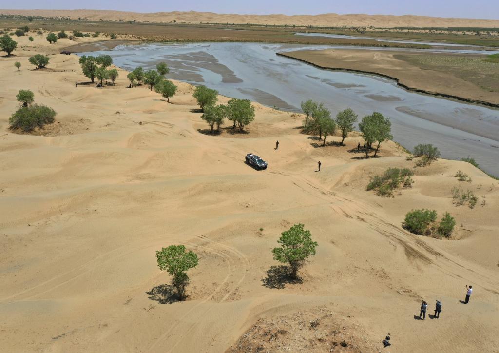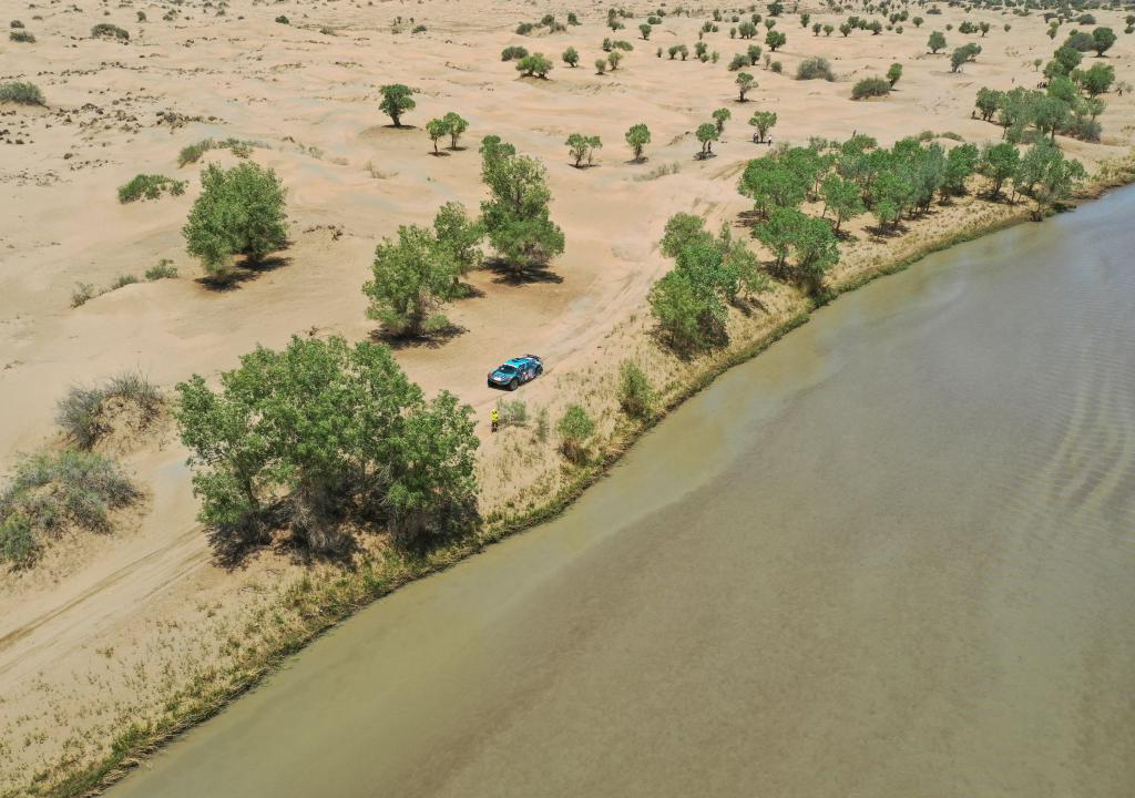 5月29日,明源实业CR6赛车队车手王世林、领航员田雷驾驶赛车疾驰在克里雅河畔的沙漠上(无人机照片)。新华社记者 胡虎虎 摄