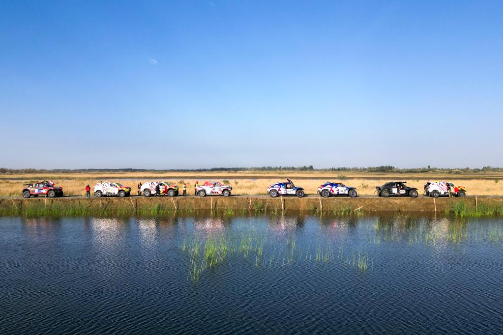 5月29日,赛车在第七赛段出发点排队等待出发(无人机全景照片)。新华社记者 郝昭 摄