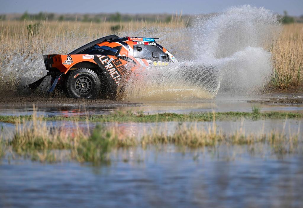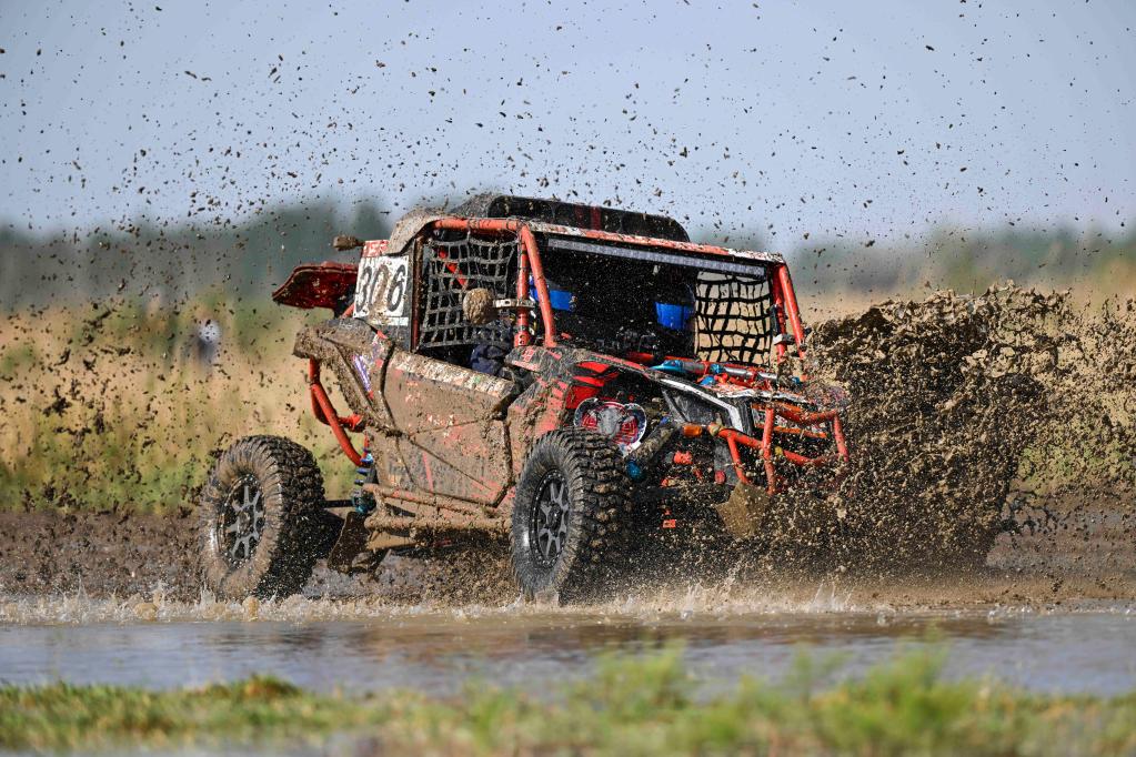 5月29日,陕西沙豹俱乐部极道体育车队车手谢渤、领航员胡文驾驶赛车通过一处涉水路段。新华社记者 胡虎虎 摄