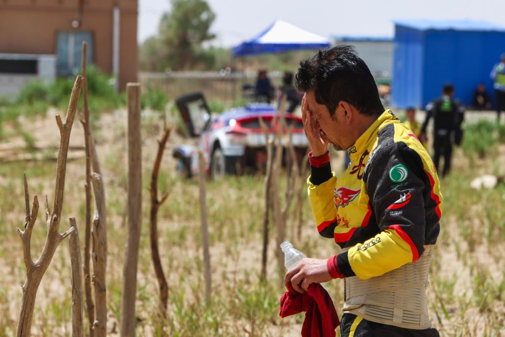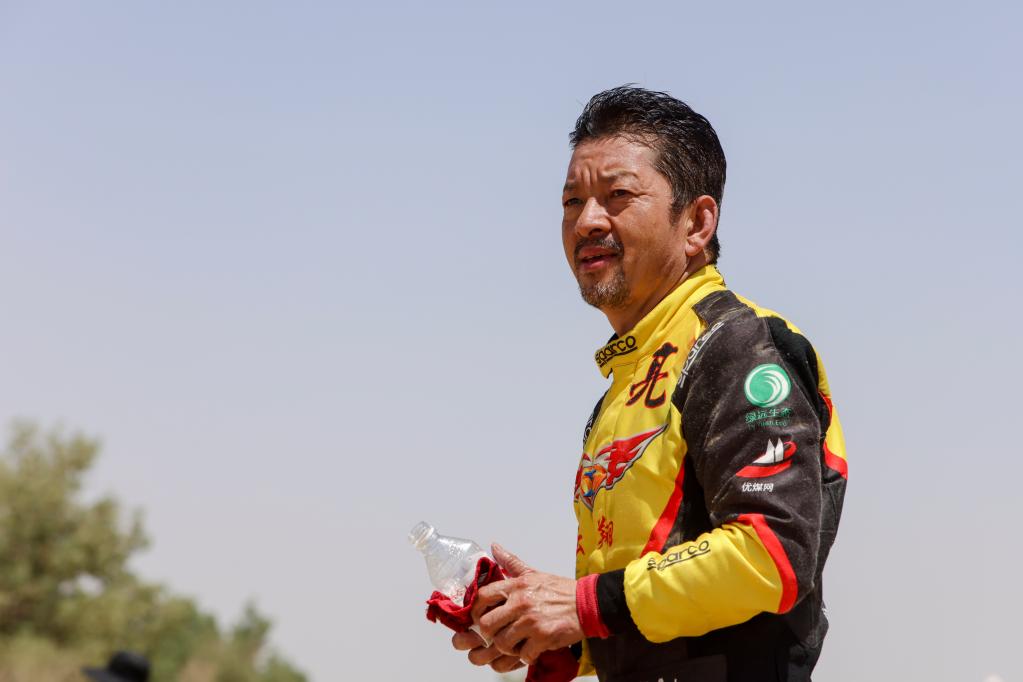 5月29日,月风拉力车队车手董超越过终点后补水休息。新华社记者 郝昭 摄