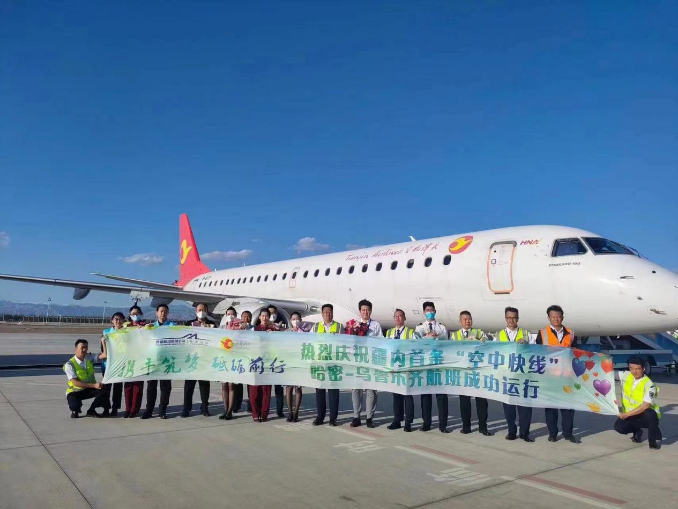 天津航空选用E190机型执飞哈密至乌鲁木齐空中快线航班,班期为每周二、四、六执行,航程仅需90分钟。“哈密-乌鲁木齐”空中快线以“公交化”的空中专线模式运营,打破了传统上提前2小时到达机场等待的概念。选乘此航班的乘客可根据航班起飞时间提前30分钟到达机场,到达机场后可享受快线专柜值机柜台、快线乘客专人引导、专属安检通道等专属服务,为其快速办理登机手续。