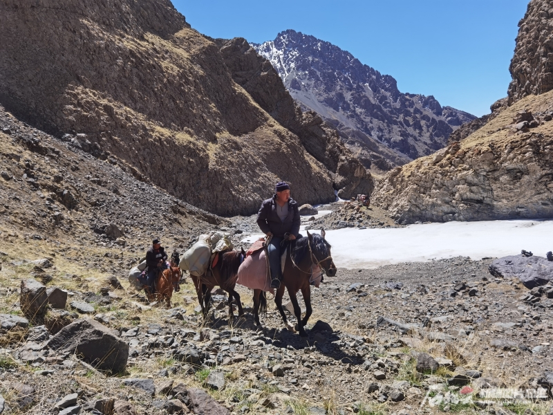 下山路树木稀少,马匹走在近50度的斜坡上,小路仅有两拳宽,一边是山脊,一边是深深的沟壑。周围碎石密布,马蹄像是踩在滑板上,每走一步,马小心、人担心。
