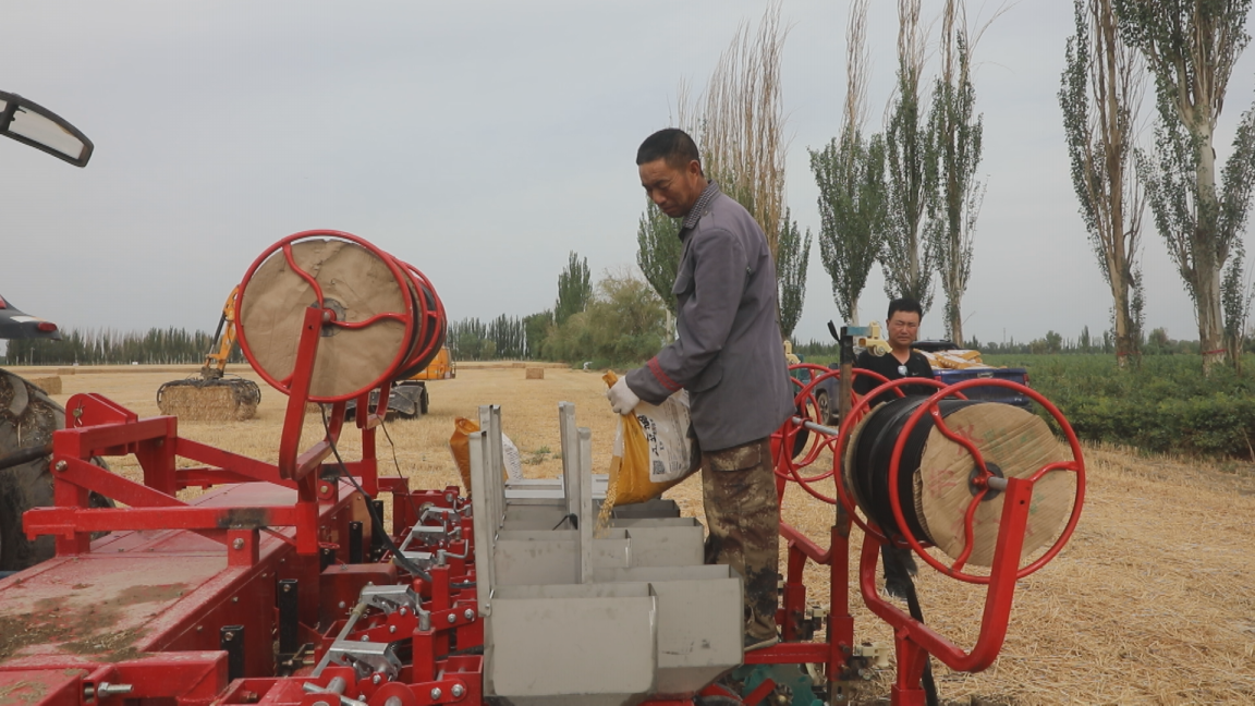 在第一师十二团塔南镇二十二连职工沈科刚收完的麦田里,播种机正在田间进行大豆复播准备工作,沈科在地头忙着给播种机添加种子,更换滴灌管,忙碌的脸上洋溢着播种的喜悦。今年,二十二连借助北斗卫星导航系统以及首次引进的北斗导航免耕大豆播种机,实现无人播种、覆土、铺设滴灌带等一体化自动作业。