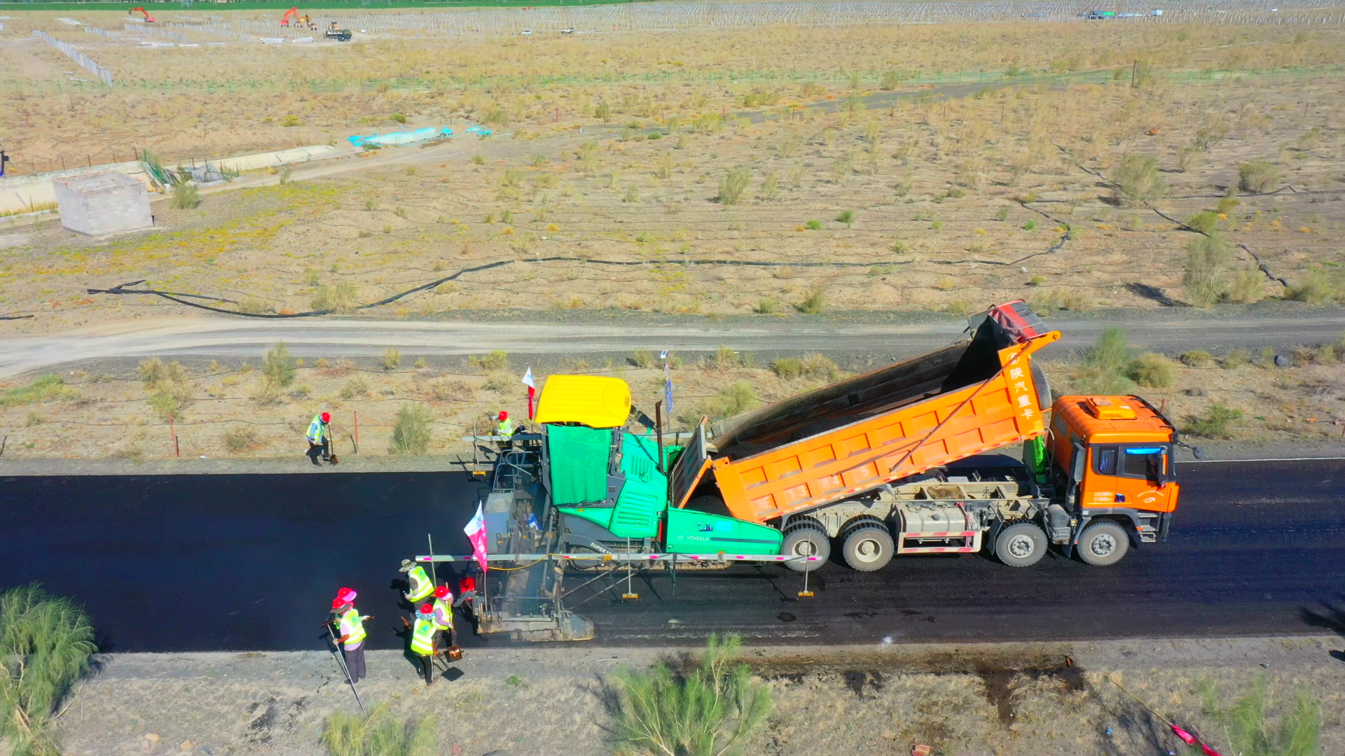 7月14日,在精河县茫丁乡Y032线K17+647岔口--嘠顺呼都格村公路建设项目沥青摊铺的施工现场,沥青摊铺机和压路机正在同步施工作业,工人们有序协助沥青摊铺机进行摊铺工作。项目现场技术员李静向记者介绍道:“现在进行的是 Y032线摊铺施工,从7月6日开始摊铺,到现在已经摊铺了12公里左右,预计7月19日全线摊铺完成。”