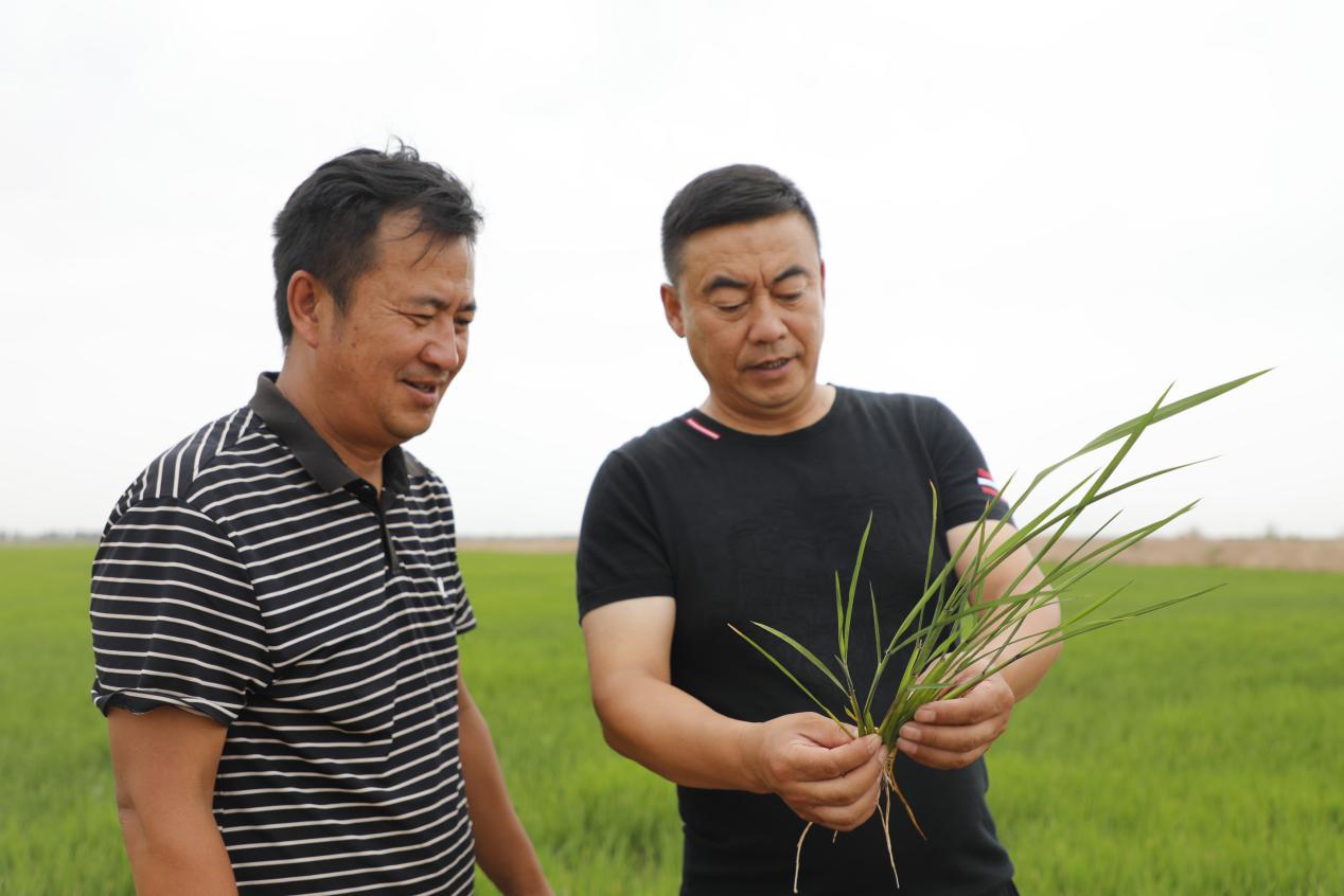 禾禾米业有限责任公司总经理冯刚(右)在查看水稻长势。杜新民摄
