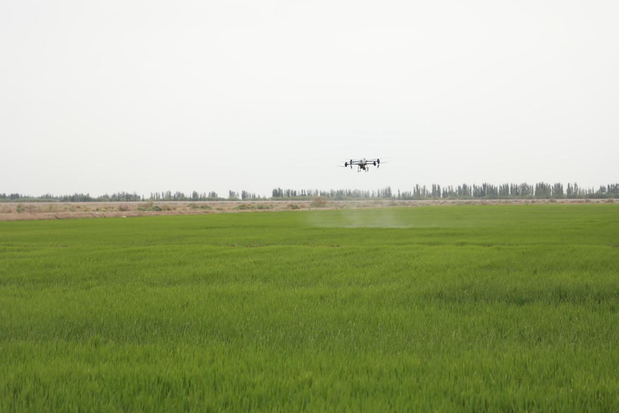 盐碱得到有效控制,在种植过程中,企业将一系列现代化的种植技术注入全过程。无人植保机播种、施肥、喷药,还聘请一师阿拉尔市农业科学研究所的专家当“科技保姆”,全程进行技术服务,目前水稻长势良好。这两天,水稻处于分蘖后期,基地内无人植保机正抓紧喷施叶面肥,力促水稻丰产丰收。