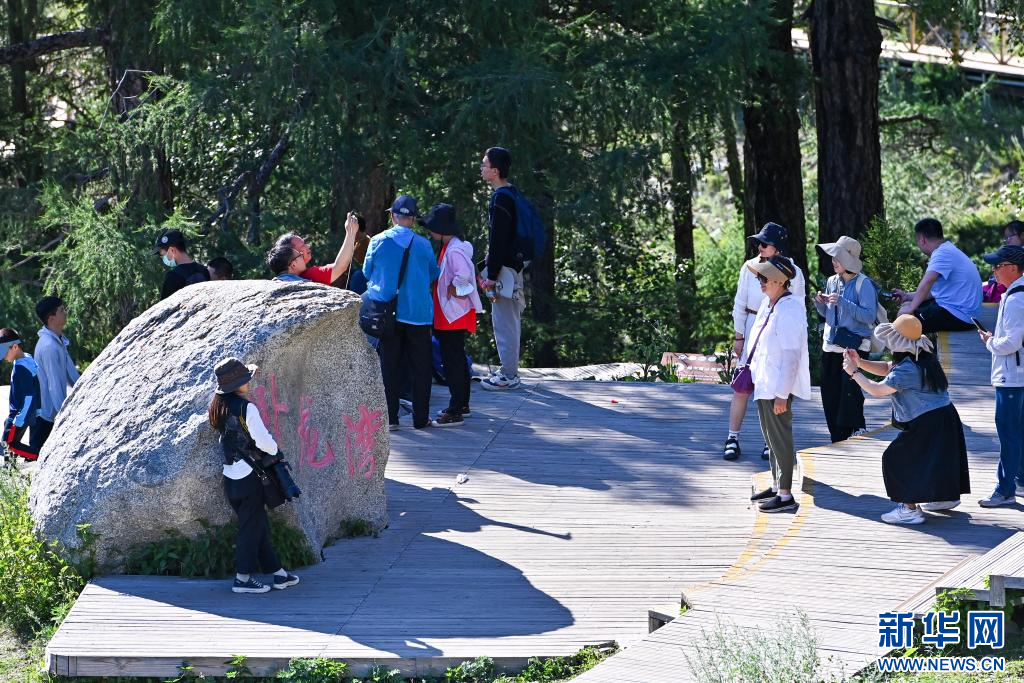游客在新疆阿勒泰地区喀纳斯景区内的卧龙湾打卡拍照(7月19日摄)。新华社记者 丁磊 摄pagebreak