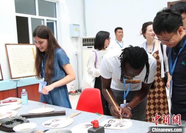 图为各国网络达人在克拉玛依市白碱滩区美术馆体验中国书法。苟继鹏 摄