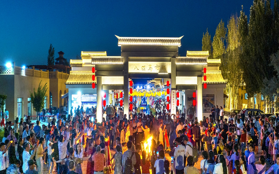 乌尔禾区“西部乌镇”八匹马市场,当地居民和游客参加篝火晚会,品尝特色烧烤等美食。克拉玛依日报全媒体首席记者 闵勇 摄