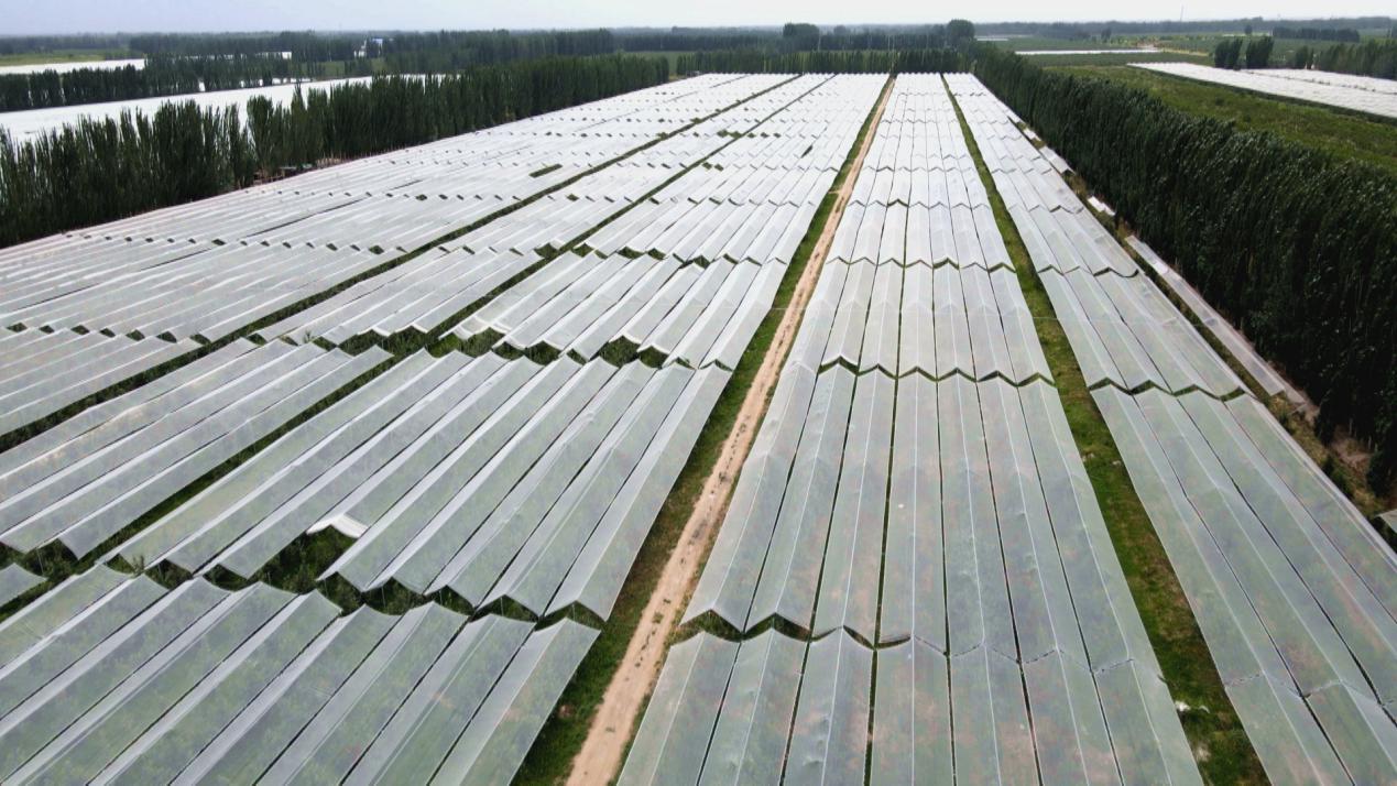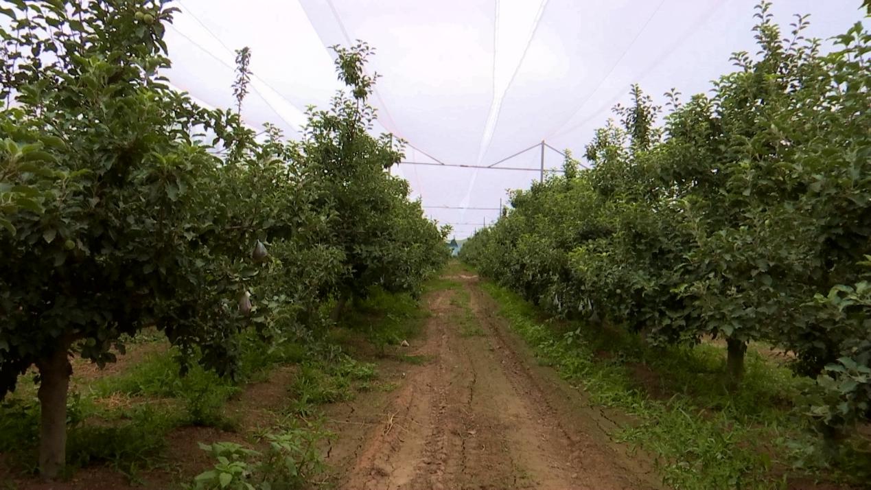 五团沙河镇搭建了防雹网的苹果园。李康 摄